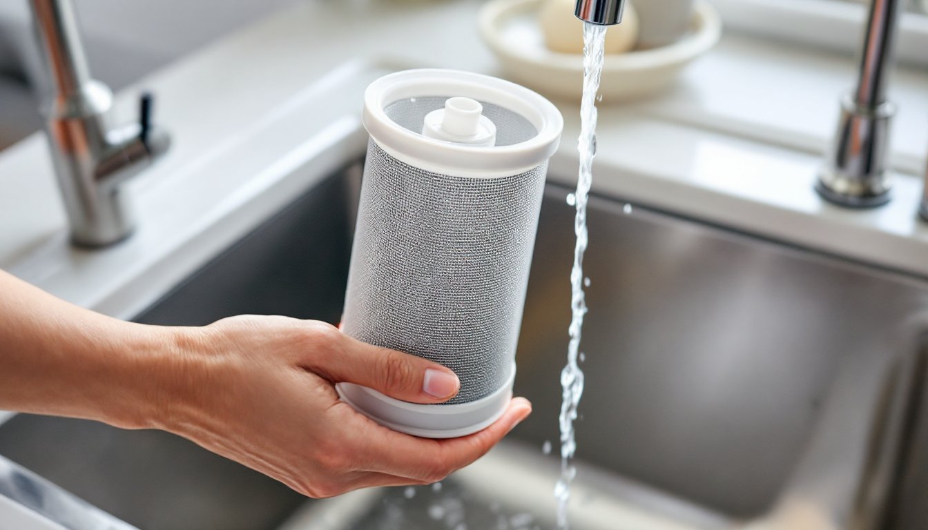 If there’s stubborn buildup or a greasy film, soak the filter in a solution of warm water and white vinegar (1:1 ratio) for 10–15 minutes, then scrub again.